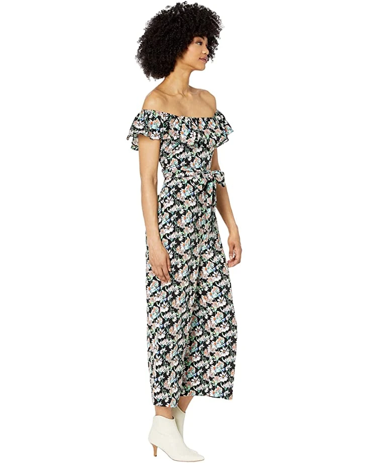 - Lightweight jumpsuit boasts a ruffle detail at off-the-shoulder neckline and short sleeves.